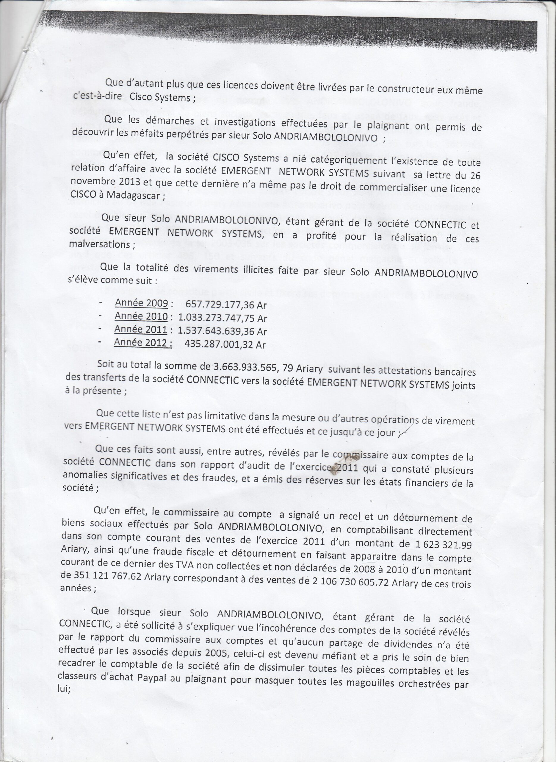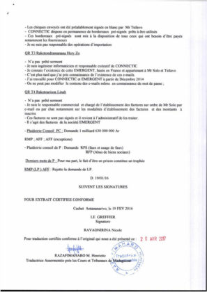 RANARISON Tsilavo a signé la totalité des 76 virements de la société CONNECTIC vers la société française EMERGENT que RANARISON Tsilavo considère comme sans contrepartie dans sa plainte pour abus des biens sociaux contre son patron Solo
