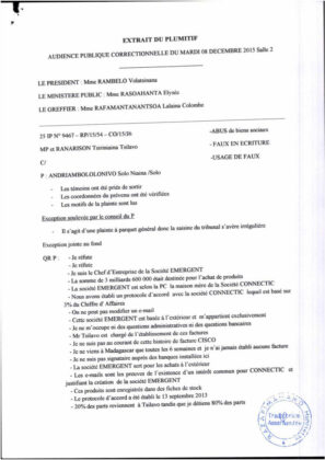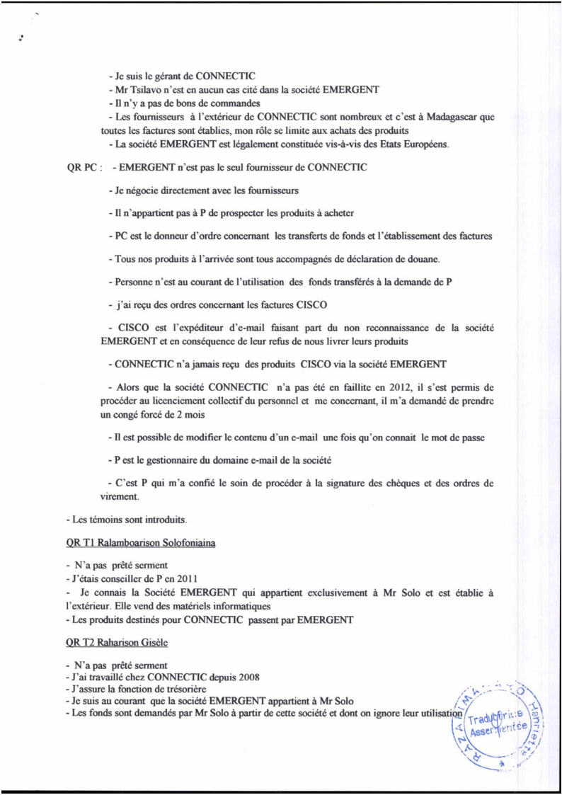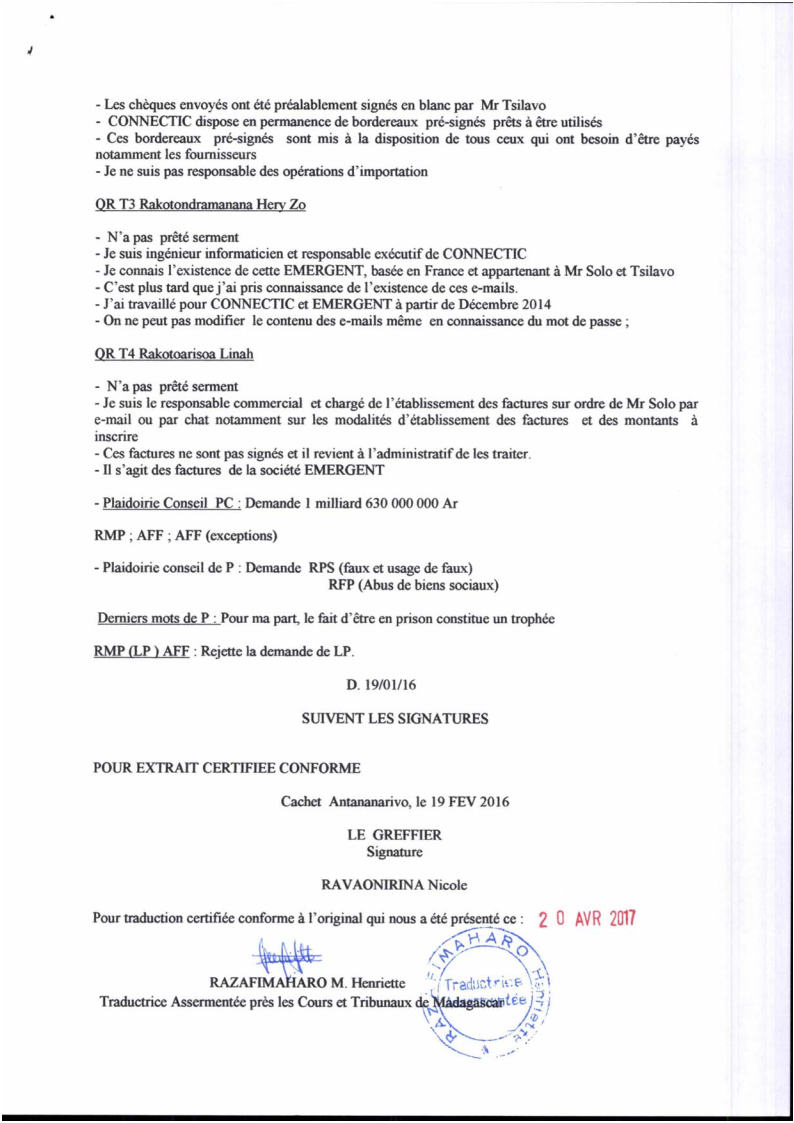Les preuves que la justice malgache a été manipulée par RANARISON Tsilavo pour faire condamner Solo, son patron, à 2 ans de prison avec sursis et 428.492 euros d’intérêts civils à régler à RANARISON Tsilavo, un simple associé, alors que c’est la société CONNECTIC qui est la victime directe et personnelle