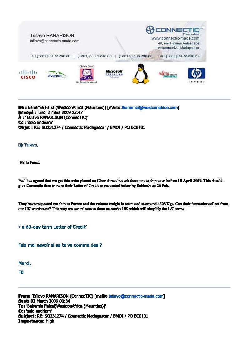 Les factures d’achat d’équipements CISCO auprès du revendeur WESTCON Africa, revendeur agréé CISCO, ainsi que les échanges de correspondance par la société française EMERGENT NETWORK d’après un schéma de travail tripartite (CONNECTIC – WESTCON AFRICA – EMERGENT NETWORK )établi par RANARISON tsilavo lui-même en mars 2009. RANARISON Tsilavo a lui même établi une facture d’IOS (logiciciel de CISCO) de 20.000 euros en mars 2009
