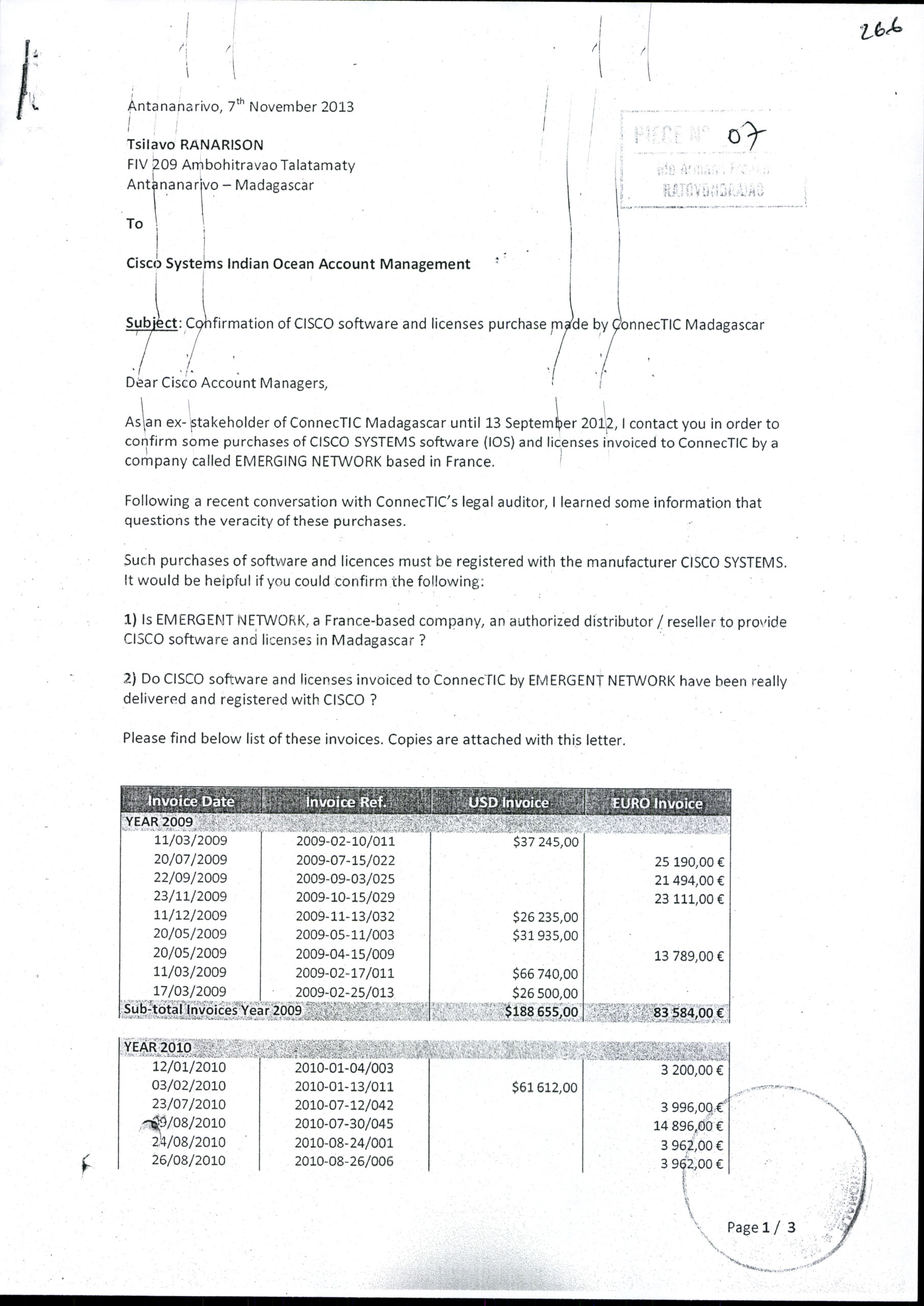 - Factures présentées : Les transactions étaient accompagnées de factures claires, listées dans une lettre envoyée par Ranarison à Cisco en novembre 2013.